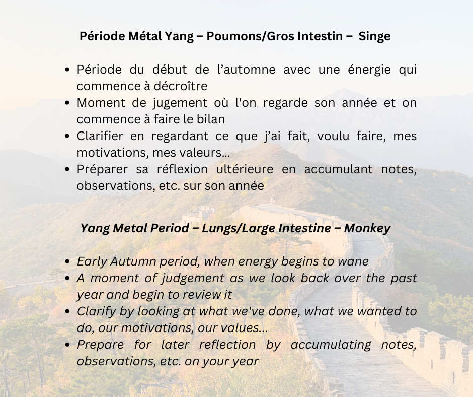 Normalement, à l’extérieur il fait encore assez chaud mais on est dans la période où l’été va basculer. On va retourner à une température un peu inférieure. D’ailleurs, dans le monde entier, c’est une période où il y a moins de travail, c’est la période des congés, un peu partout, il y a moins d’activités. C’est naturellement un moment où on est là pour commencer à réfléchir à ce qui va être fait. Plus tard dans la saison de l’automne, on va véritablement mettre en place des choses qui doivent changer. On va couper, arrêter des manières de faire. Pour le moment, on est juste sur la première partie, cette énergie Métal Yang qui monte très fort.