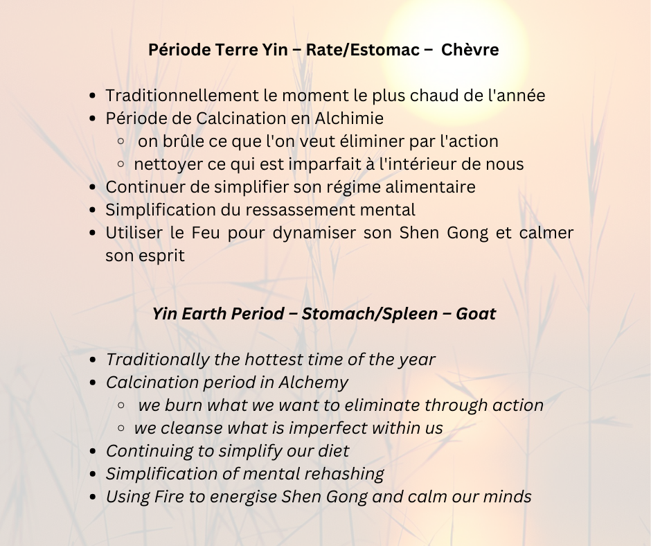En général, c’est un moment où la chaleur nous donne envie de faire peu de choses ou des choses très simples, et ce n’est pas un problème. C’est une bonne période pour en faire moins physiquement, mais aussi excellente pour faire son Shen Gong et Nei Dan à l’ombre et faire un peu d’exercices le matin ou le soir. Profitons de cette chaleur pour brûler et calciner ce que l’on veut éliminer. On est dans un moment où, dans l’action, on peut éliminer de son quotidien ce qui doit l’être. C’est un moment de calcination tel que l’on a vu dans l’Alchimie.