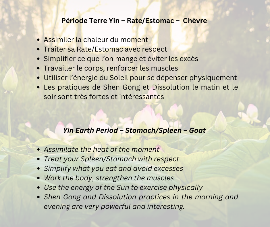 It's a time of diet, when we treat our Spleen/Stomach with respect, and when we can repair them most effectively during the year. We pay attention to what we eat, we don't overeat, and we don't overindulge in general. Let's simplify what we eat: very few condiments or spices. Only proteins with vegetables, not too many starchy foods, not too much pasta or bread. To give our Spleen/Stomach a little breathing space and keep it as simple as possible, which gives it its strength.
