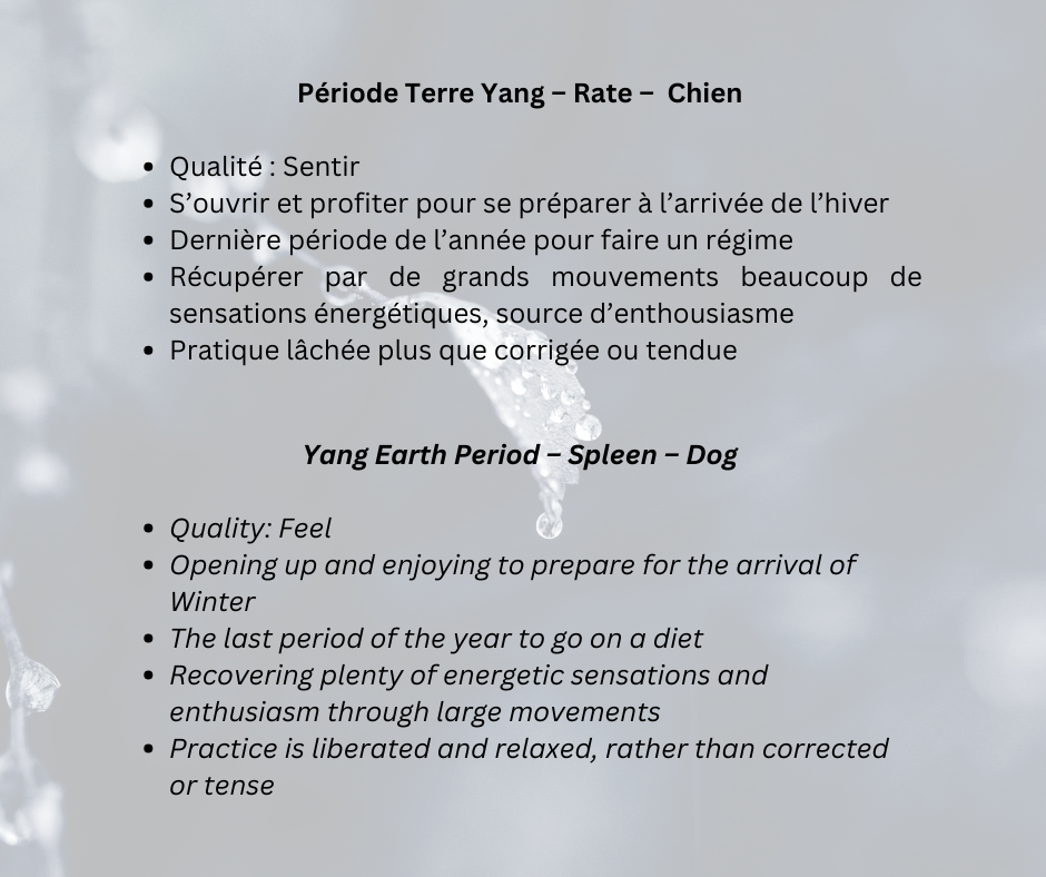 This period is linked to the Dog - XU - which calls for attentiveness to the Yang Ming, to assimilation: it's this energetic layer that allows us to assimilate that which is not us within us.